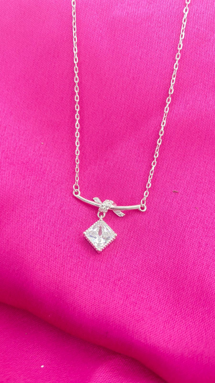 Um acessório delicado e sofisticado que traz charme e brilho em cada detalhe. O design combina um fino laço cravejado com zircônias cintilantes e um pingente em formato quadrado com lapidação brilhante, que reflete a luz de forma deslumbrante.